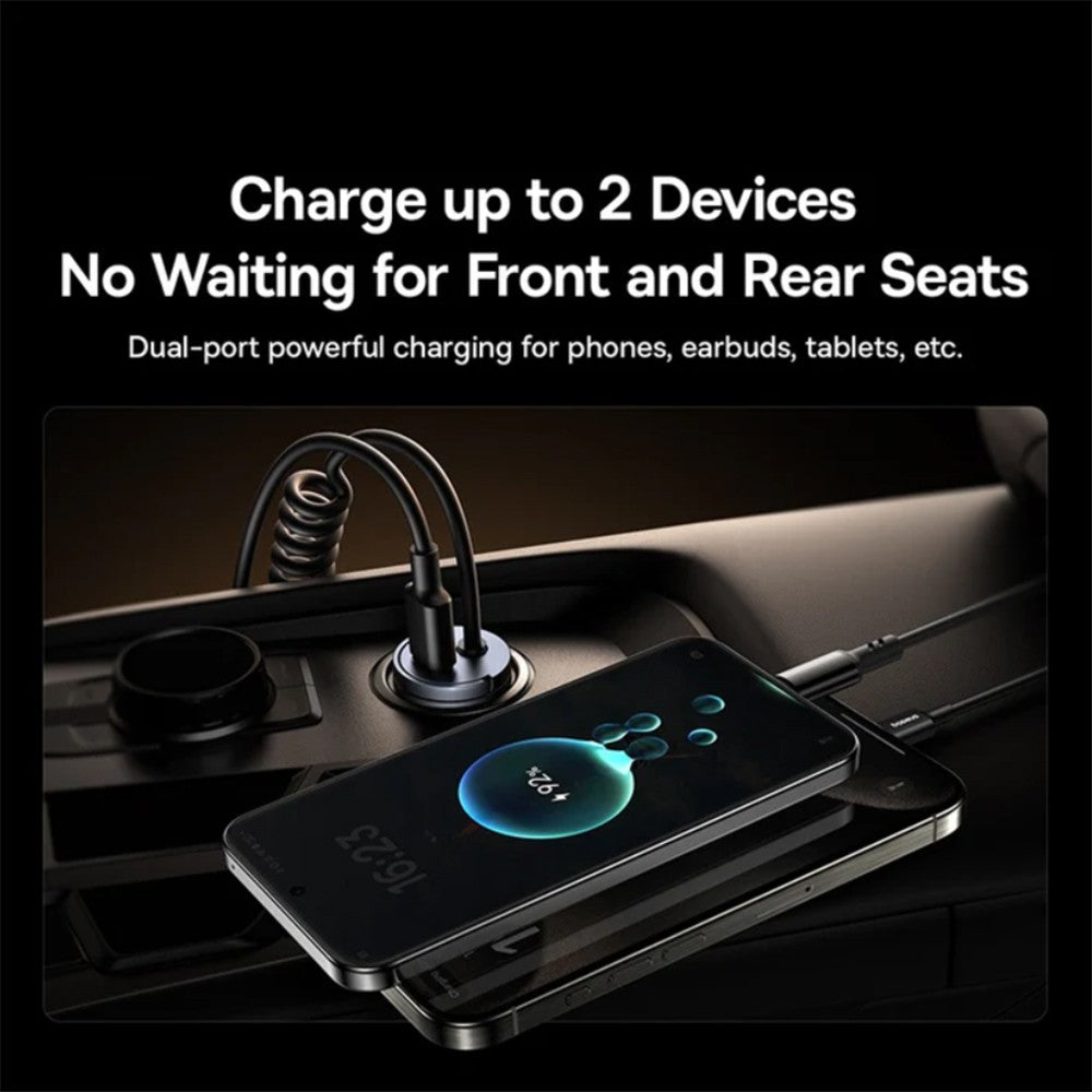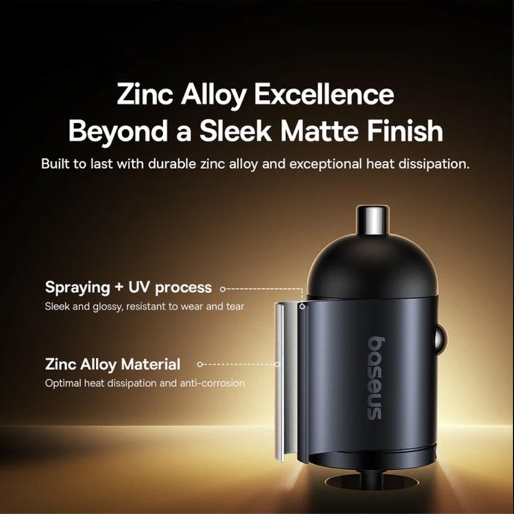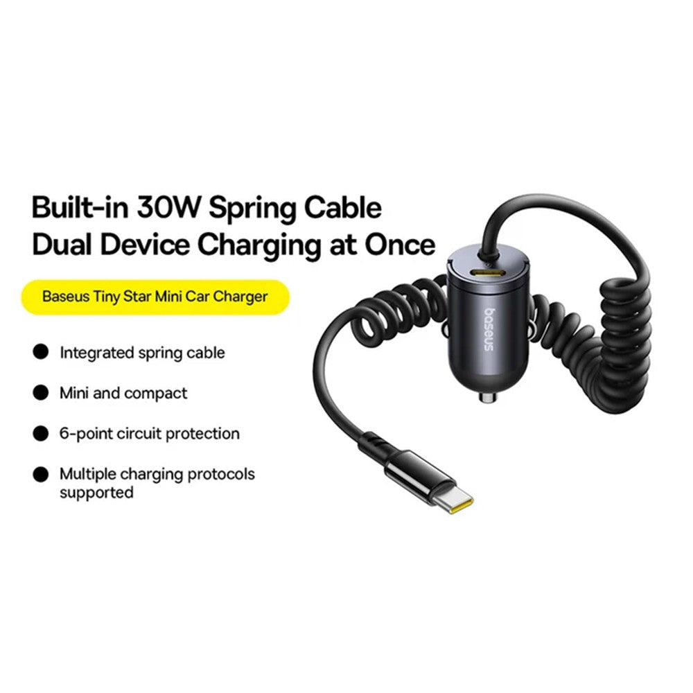 The Baseus Tiny Star Mini Car Charger offers 30W fast charging with dual Type-C ports, enabling simultaneous charging of two devices