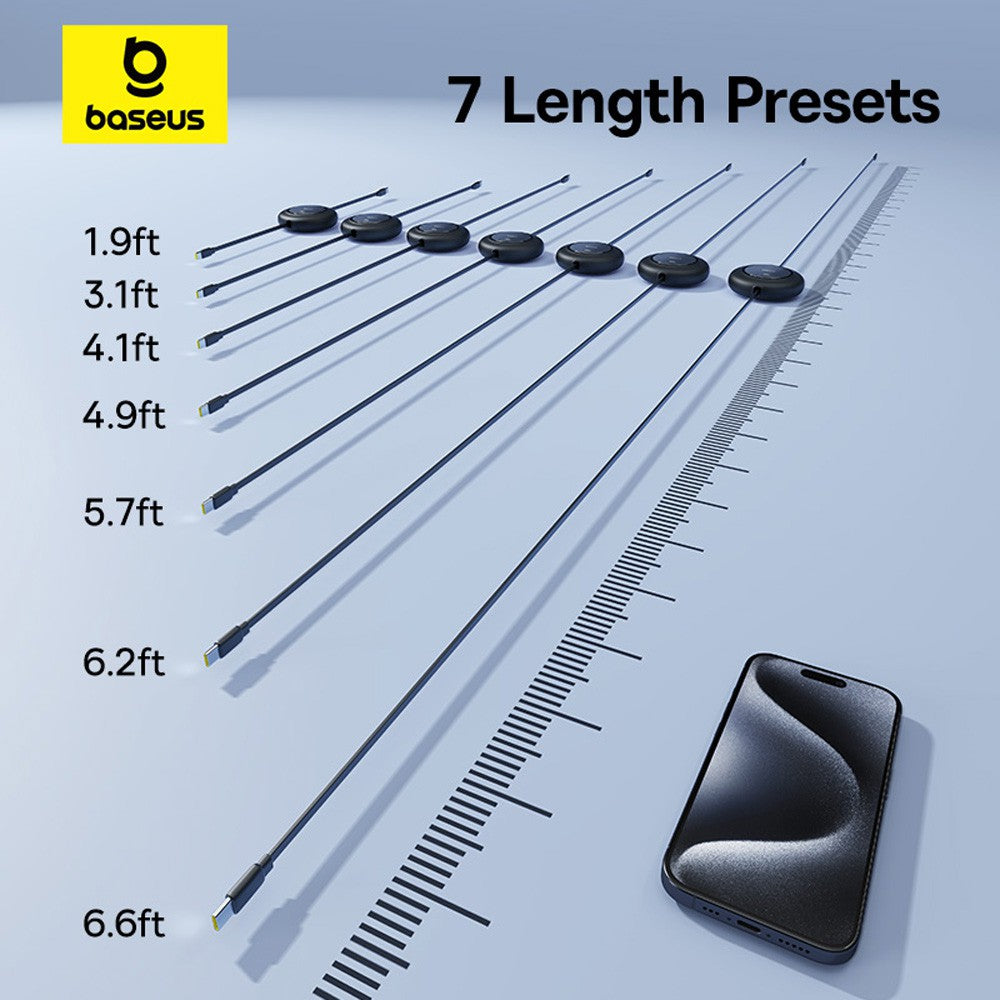 Designed for convenience, the Baseus USB-C cable features up to 7 adjustable length presets, this retractable USB-C cable features a compact cable storing case. Extend for use and retract for storage, smoothly and snag-free. It is lightweight, mini, and compact, ideal for travel, offering easy storage without cable entanglement.