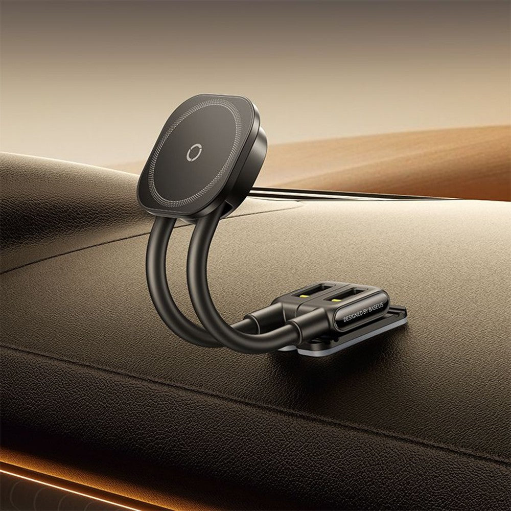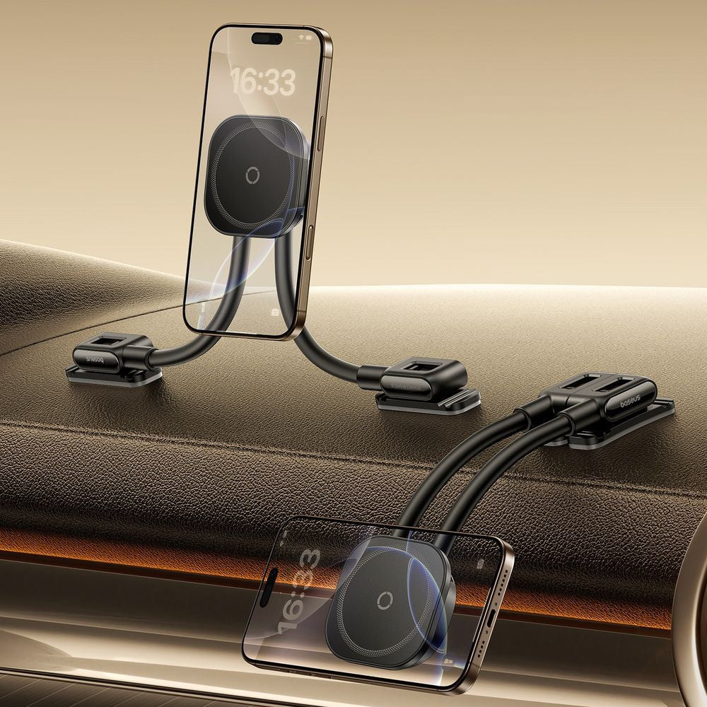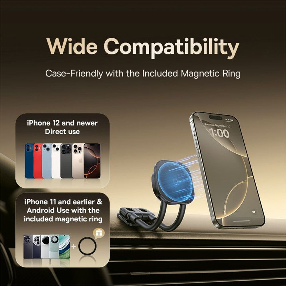 Universally compatible via MagSafe/ring, it mounts securely on dashboards/windshields for flexible, stable use.